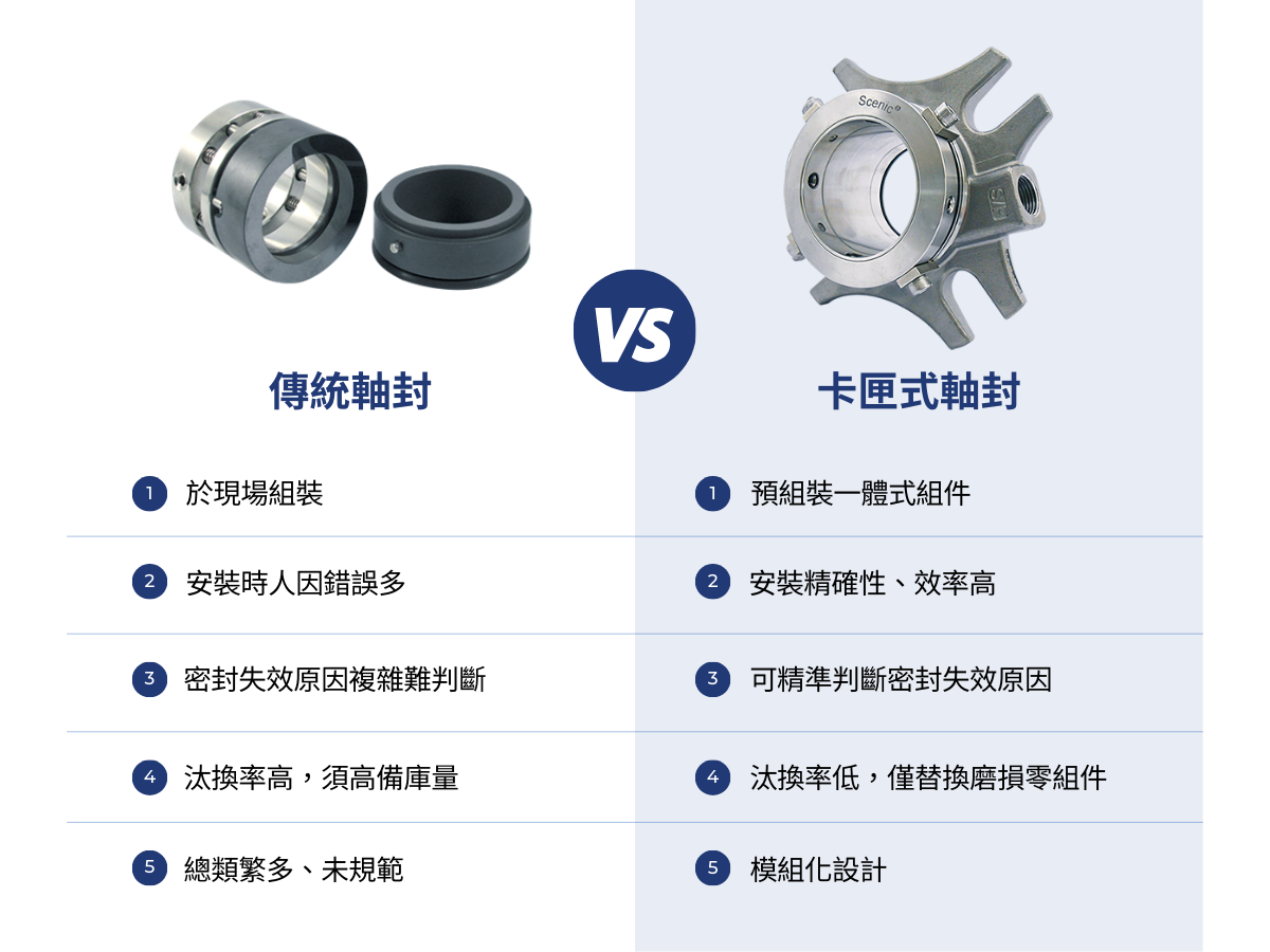 傳統軸封初始成本較卡匣式低,但使用壽命短、損壞頻繁,維修時間長且步驟繁瑣,需要熟練有經驗的技術人員,已不符合時代的效益。