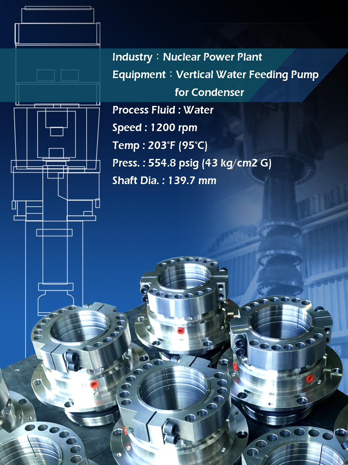 核電廠視安全為首要考量,尤其在選擇泵浦密封件方面更提出極高標準。台電核三廠初建階段,冷凝系統的飼水泵使用了填料壓蓋式軸封。然而,自啟用以來,這種封裝在面對高壓、高流量的冷凝水時,未能有效密封,每年洩漏高達4萬噸。考量到安全性的重要性,核電廠迫切要求新的密封件必須保證百分之百的可靠度,即使在運轉中絕不能因軸封故障而迫使停機維修,只能在年度保養時進行更換。